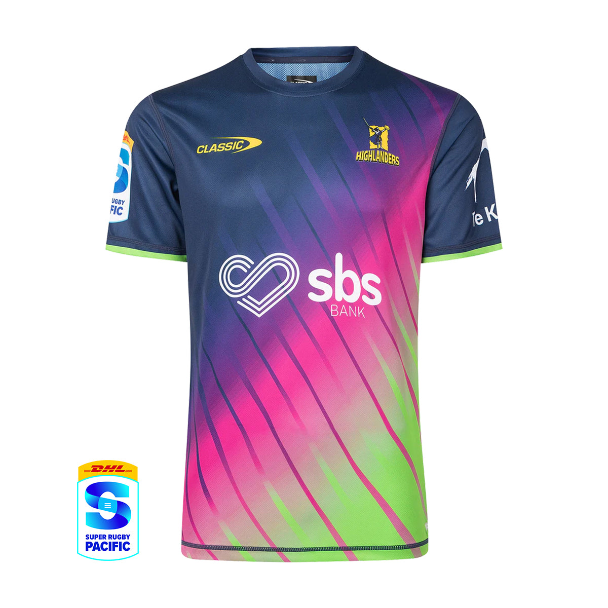 Highlanders replica pro-training tee in team colours. 100% Polyester pro-training tee with club logo left chest and sponsors. Made with Classic's Stay Cool Technology, this item features moisture wicking properties to keep you cool and dry during intense training.